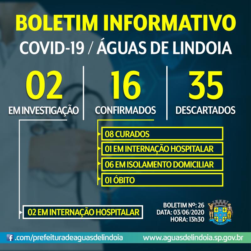 No boletim desta quarta-feira, 3, a Diretoria de Saúde informou o 16º caso positivo de Covid-19 no município. O paciente, segundo a prefeitura, já esta curado da doença. Do total de confirmados, 8 estão curados, 6 em isolamento domiciliar, 1 permanece internado e 1 faleceu.