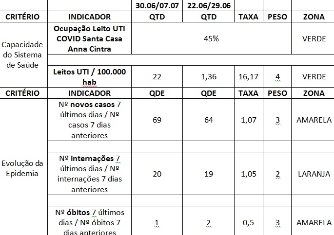 O estudo dos municípios, encaminhado ao governo estadual nesta quarta-feira, 8, apresenta o cálculo levando-se em conta o período de 22 a 29 de junho e de 30 de junho a 7 de julho. Pelo levantamento, em todo o período analisado, a ocupação de leitos de UTI para Covid-19 ficou no percentual de 45% no Hospital Santa Casa Anna Cintra, referência na microrregião.