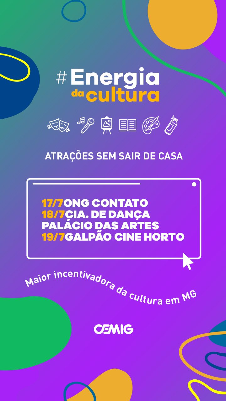 A Cemig (Companhia de Energia de Minas Gerais), em parceria com a Secretaria de Estado de Cultura e Turismo, realiza o #EnergiadaCultura, que une artistas e instituições para levar opções que garantem diversão para toda a família, sem sair de casa. A cada semana, novas atrações incríveis produzidas por artistas ou instituições apoiadas pela empresa são disponibilizadas em plataformas digitais e gratuitamente.