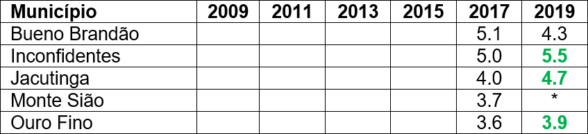 Entre os municípios da região do Circuito das Malhas, Bueno Brandão, Jacutinga e Ouro Fino superaram a média estadual nos anos iniciais do ensino fundamental, com média de 6,7 nas três cidades, enquanto o estado obteve 6,5. Monte Sião obteve média de 6,3 e não atingiu a meta padronizada para esse segmento em 2019. Inconfidentes ficou com a menor média: 6,2.