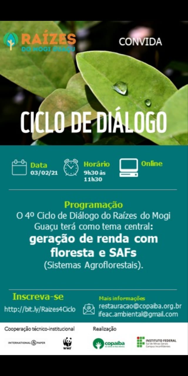 Será realizado no dia 3 de fevereiro, das 9h30 às 11h30, o 4º Ciclo de Diálogo do Raízes do Mogi Guaçu, um programa resultado da cooperação entre o WWF-Brasil e International Paper e realização da Associação Ambientalista Copaíba e da IFEAC/Instituto Federal do Sul de Minas Gerais. O encontro, que será gratuito e totalmente online, terá como tema central: Geração de renda com floresta e SAFs (Sistemas Agroflorestais).