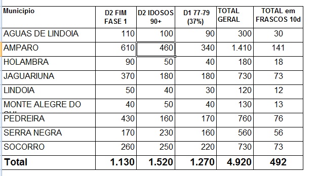 Na região, as quantidades de CoronaVac disponíveis para 2ª dose 1ª fase, 2ª dose idosos 90 anos + e 1ª dose 77 a 79 anos são as seguintes : (veja o quadro)