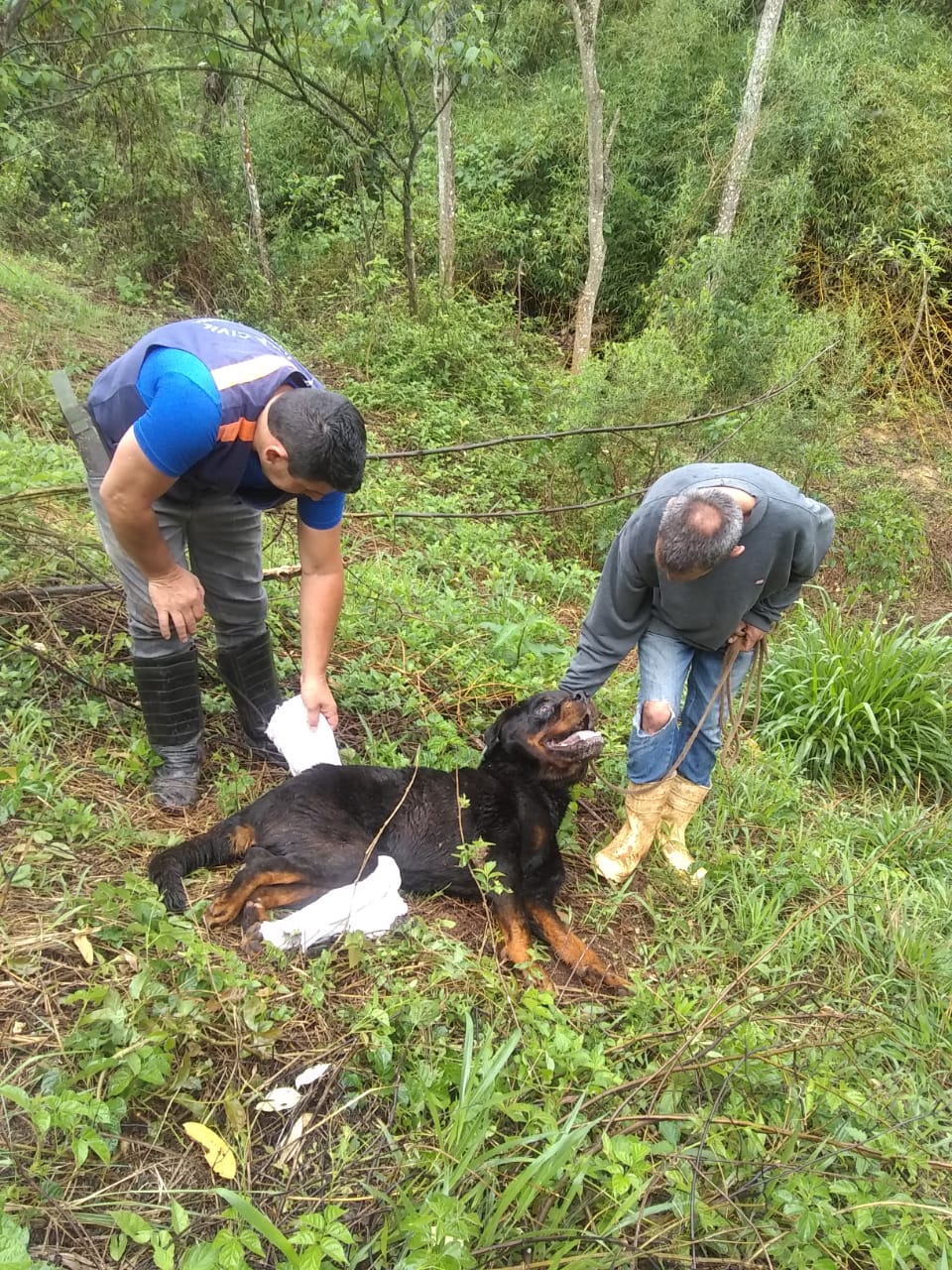 O animal foi encontrado em local de mata fechada e teve que ser transportado manualmente por dentro do mata até um sítio vizinho. O cão, um Rottweiler ficou mais de 12 horas no local, tomando chuva, sem poder se locomover.