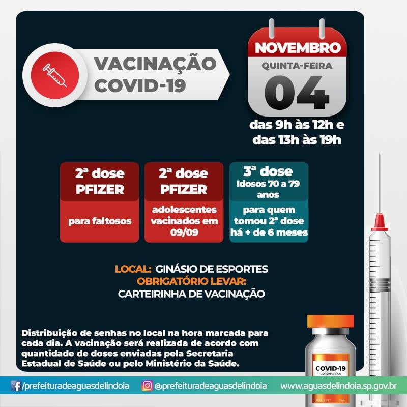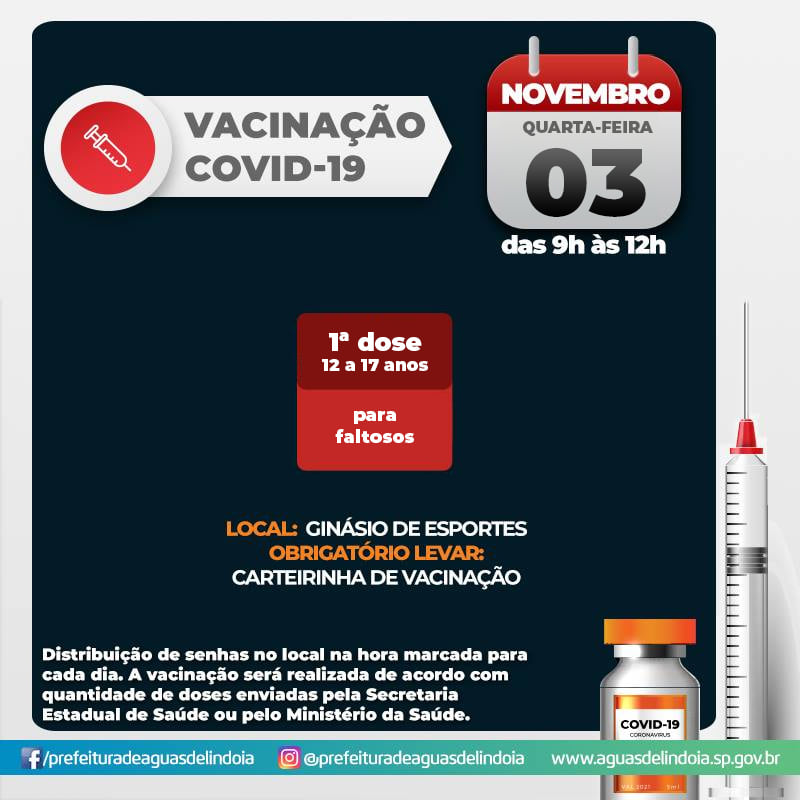 A Secretaria de Saúde de Águas de Lindoia realiza nesta semana mais uma etapa da Campanha de Vacinação contra a Covid-19. Nesta quarta-feira, dia 3, haverá vacinação repescagem 1ª dose, para 12 a 17 anos, das 09 às 12h, no Ginásio de Esportes, ao lado da EE Dr. Francisco Tozzi.