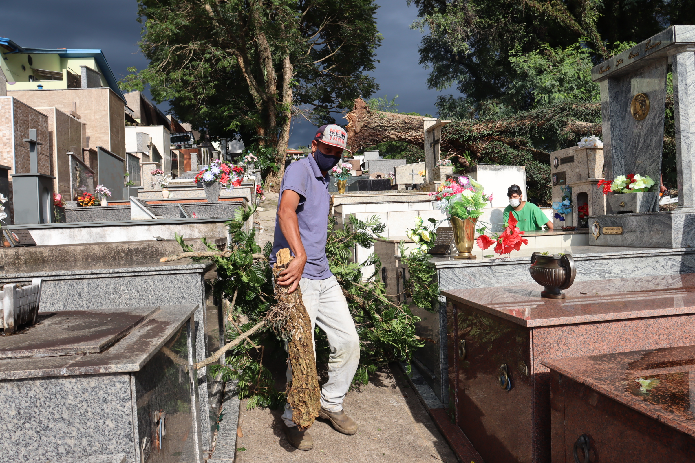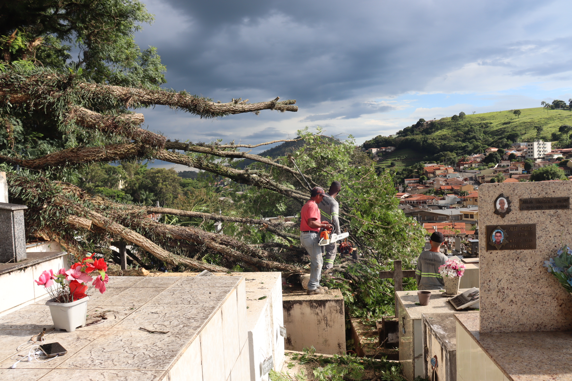No Cemitério Municipal Jardim da Saudade também houve quedas de árvores. Os galhos foram recolhidos no período da manhã desta terça-feira. Houve queda de duas árvores, inclusive atingindo um veículo, na Rua Ana Belmira de Novaes, no Bairro Estância Suíça.