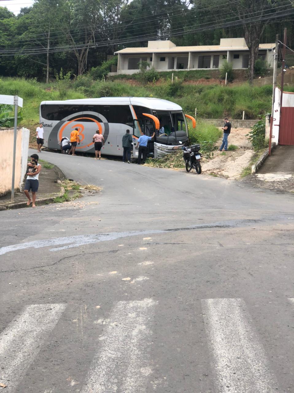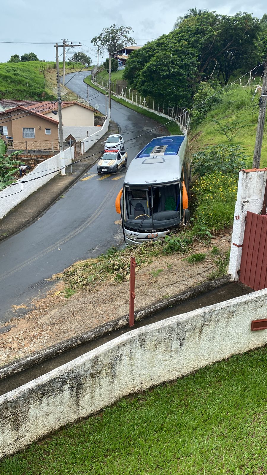 Um ônibus fretado, de excursão, que descia da Rua Luís Gusson, colidiu com um barranco, após frear bruscamente, tendo uma passageira arremessada para fora do veículo, devido ao impacto da freada. O fato ocorreu por volta das 13h30, na tarde desta sexta-feira, 07.