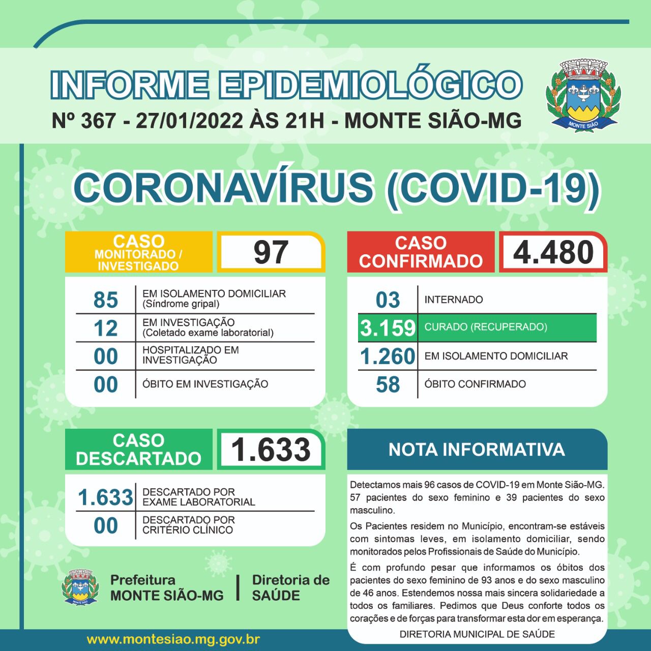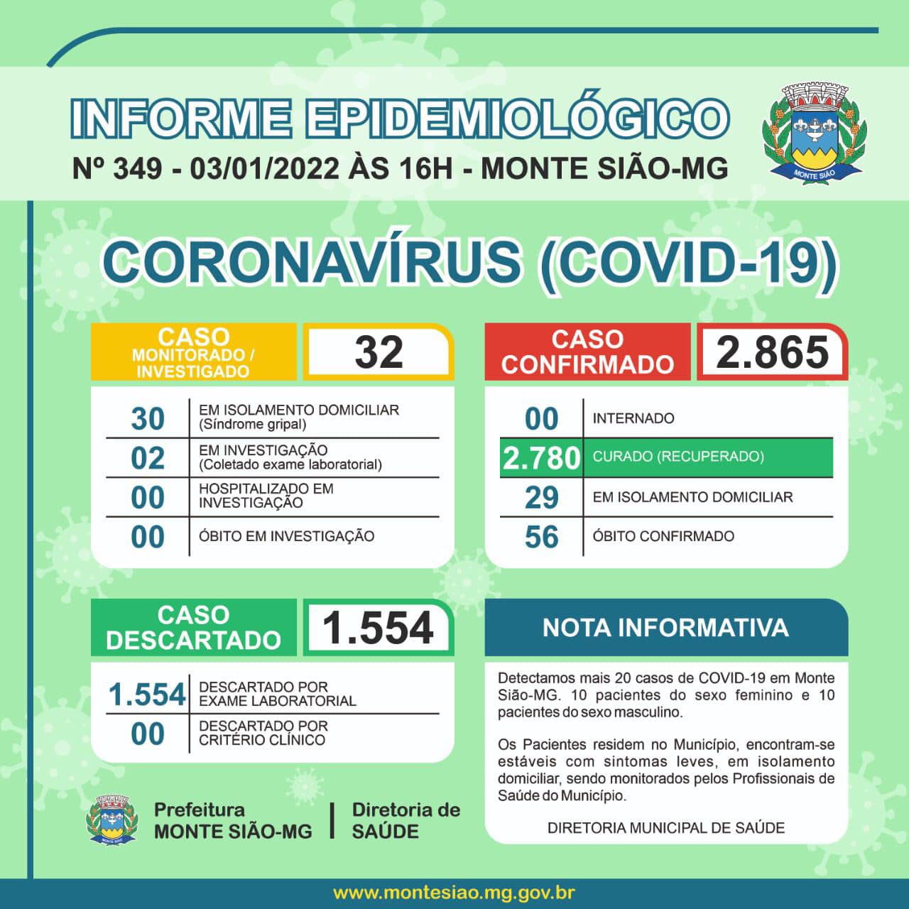 A situação geral de Monte Sião no momento é de 1260 casos ativos de Covid-19, sendo que 96 casos foram confirmados nas últimas 24 horas. Existem ainda 97 casos suspeitos que aguardam exames, sendo que 85 estão em isolamento domiciliar e 12 são casos em investigação.