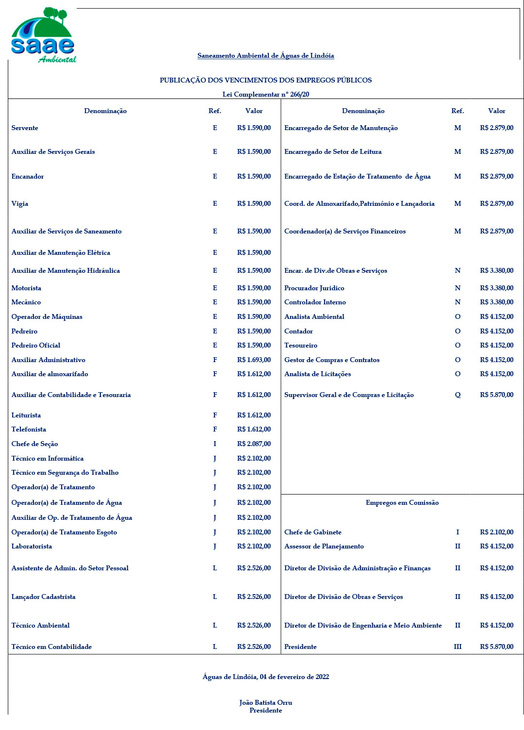 SAAE – PUBLICAÇÃO DOS VENCIMENTOS DOS EMPREGOS PÚBLICOS