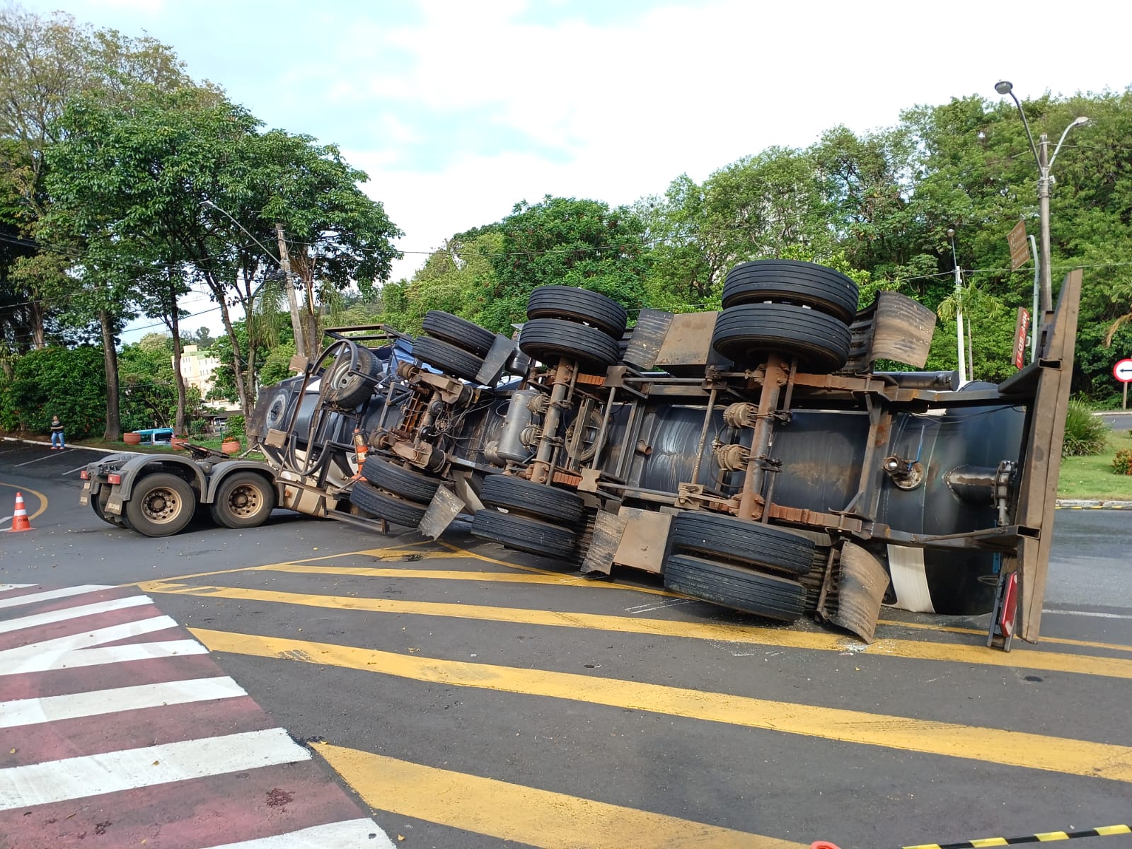 O acidente ocorreu, segundo divulgado nas redes sociais, porque a pista estava molhada em razão da chuva. Segundo a Guarda Municipal o acidente foi por volta das 3h, quando o tanque da carreta, carregado com 30 toneladas de um material usado na produção de gelatina, tombou ao passar pela rotatória da avenida. Ninguém ficou ferido.