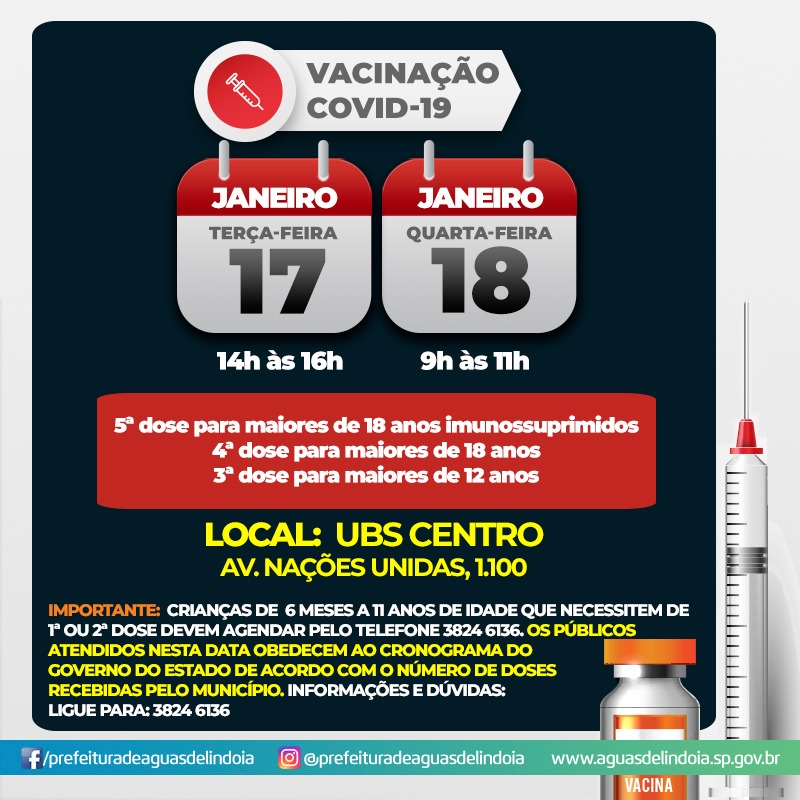 A Secretaria de Saúde de Águas de Lindoia aplica a quinta dose da vacina contra a Covid-19 para pessoas imunossuprimidas maiores de 18 anos no município com atendimento na Unidade de Saúde do Centro (Dr. José Egídio Alvarenga – Av. Nações Unidas, 1100).