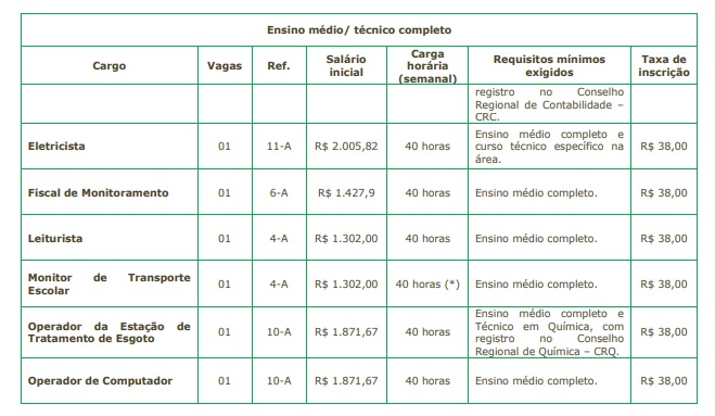 Veja a relação de Cargos, salários e valores da taxa de inscrição para o Concurso Público: