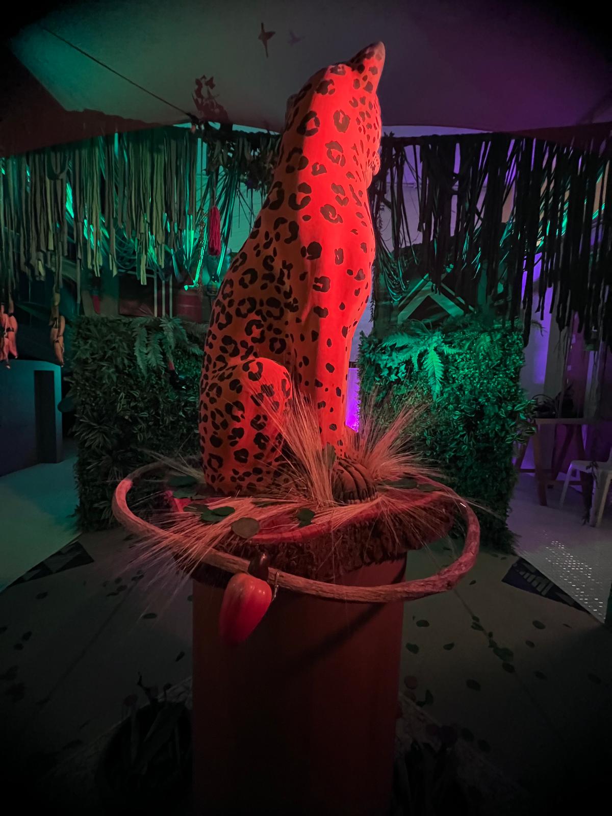 “A onça representa a rainha da floresta e ela está sentada sobre um tronco de uma madeira que veio da Amazônia, fruto de uma apreensão ilegal feita pelo Ibama e eu mostro nesse espaço, através de uma cenografia a importância das nossas atitudes e hábitos”, explica Fábio Garcia.