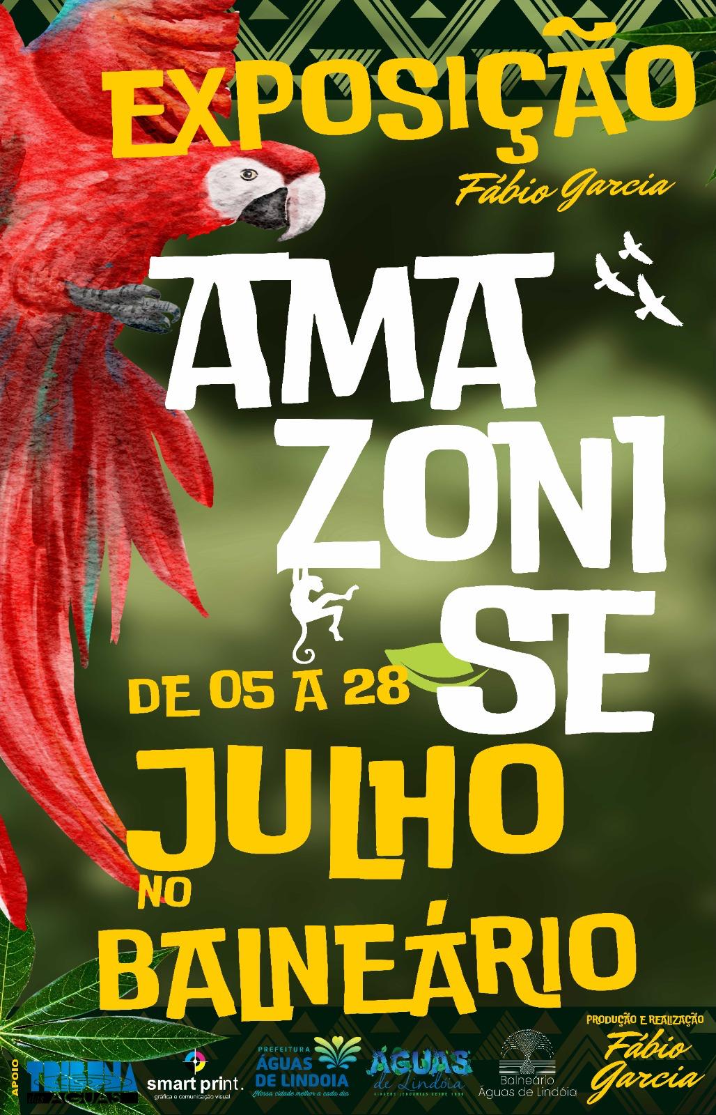 O artista lindoiense Fábio Garcia realiza no Balneário Municipal de Águas de Lindóia, até o dia 28 de julho (de quinta a domingo, de 10 as 13 e de 15 as 16 horas), a exposição Amazoni-se. O trabalho é fruto da exploração temática criada após sua estada na Amazônia, através de fotos, pinturas em telas, esculturas e artesanato.