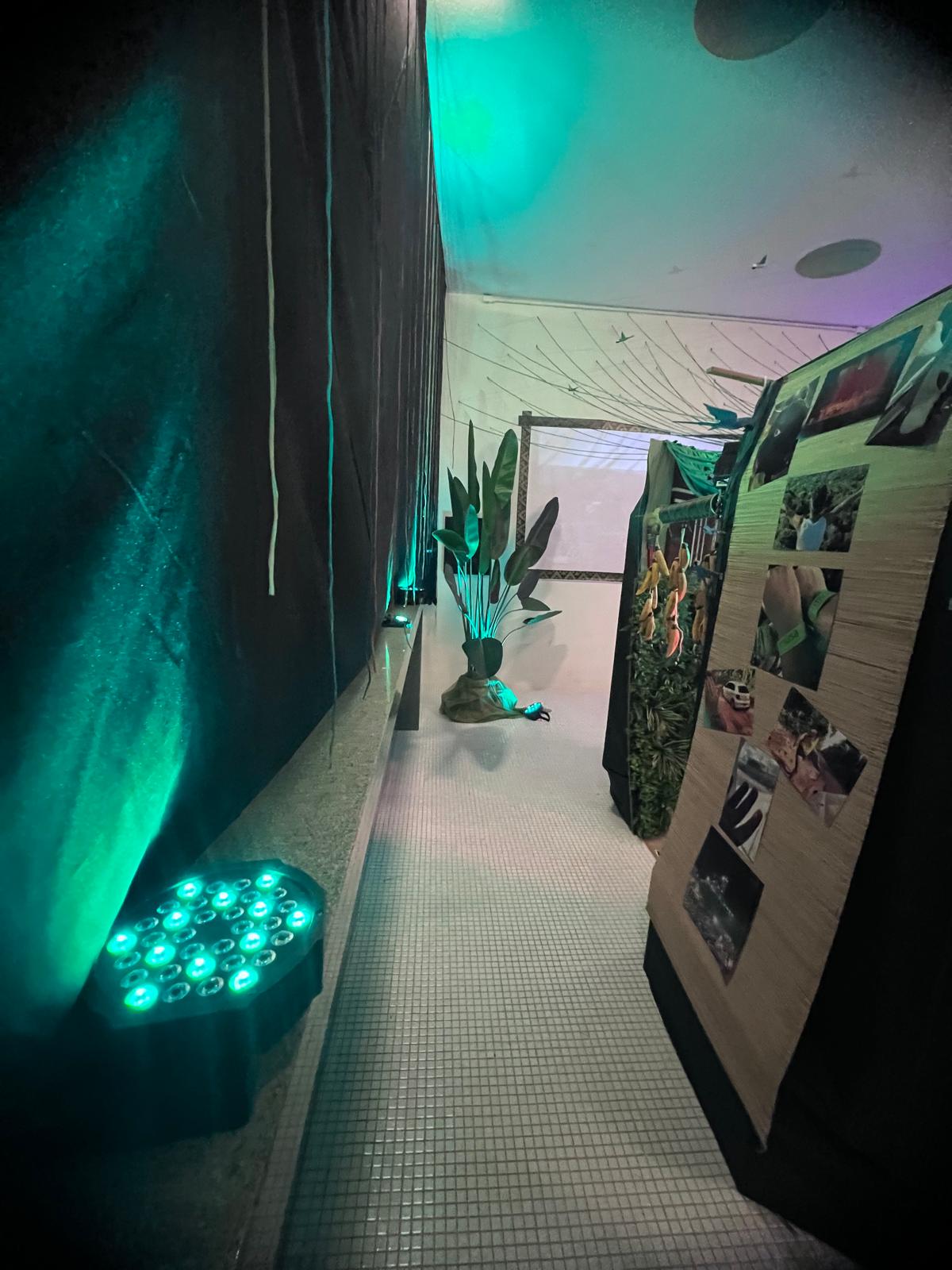 A mostra é realizada em uma cenografia de uma Oca indigena, habitada por uma onça pintada (escultura em tamanho real), com luzes e experiências sensoriais de fragrâncias da floresta. A exposição conta também com recursos audiovisuais, através de fotografias em paineis digitais, e a exibição de um documentário criado pelo autor.