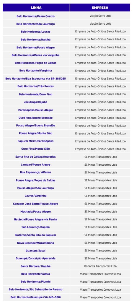 A empresa Auto-ônibus Santa Rita Ltda vai operar as linhas da microrregião do Sul de Minas, são elas: Jacutinga – Itajubá; Ouro Fino – Bueno Brandão; Pouso Alegre – Bueno Brandão; Pouso Alegre – Monte Sião; Ouro Fino – Monte Sião; Belo Horizonte – Ouro Fino e Belo Horizonte – Pouso Alegre.