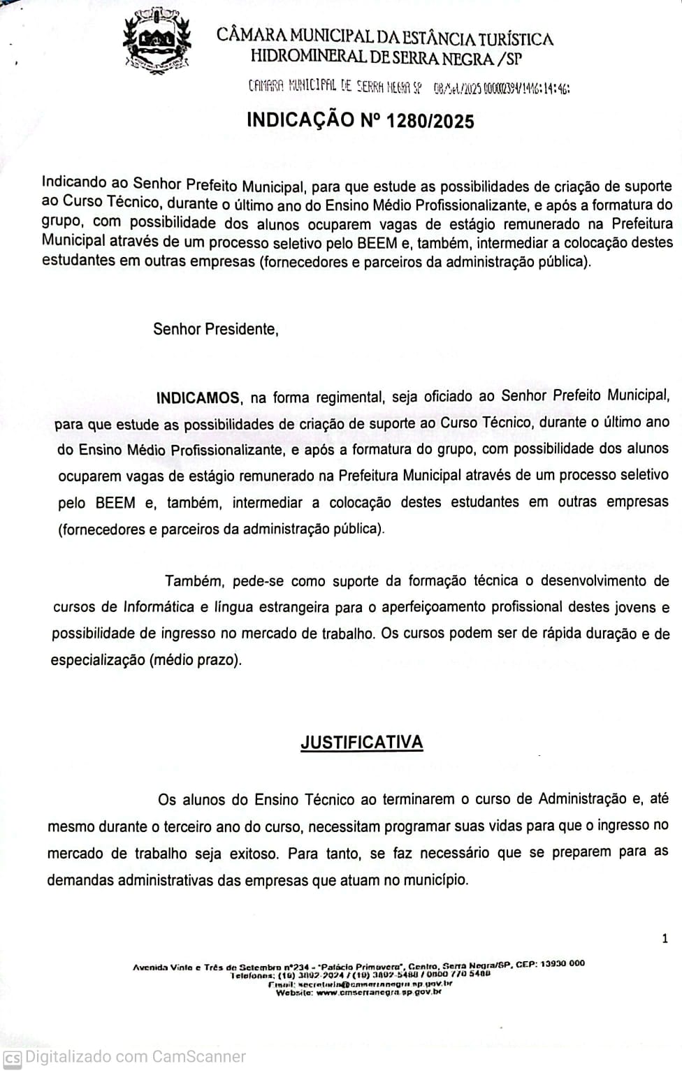 Suporte ao Curso Técnico e Balcão de Oportunidades – Indicação Nº 1280 / 2025 (2º EM ADM)