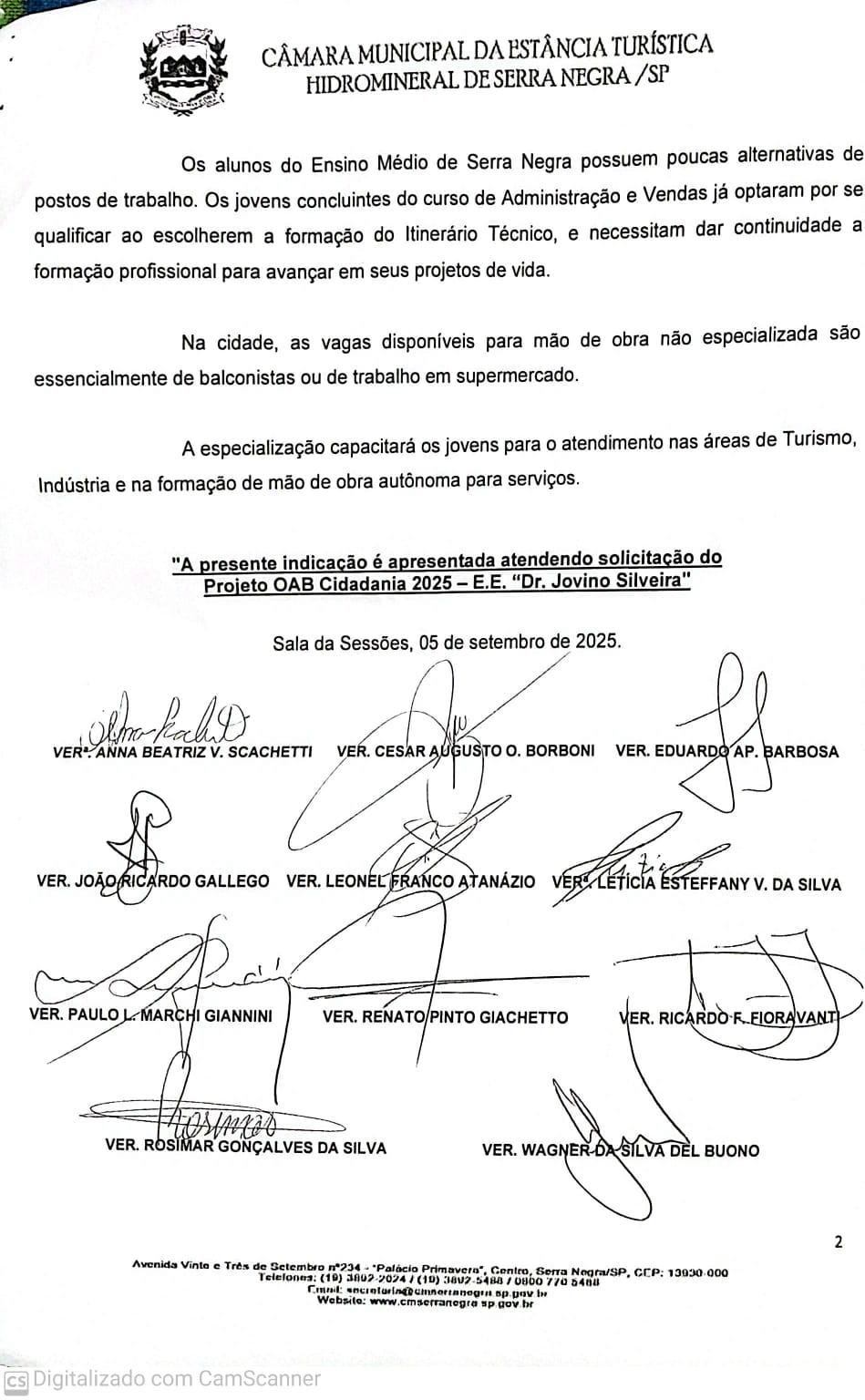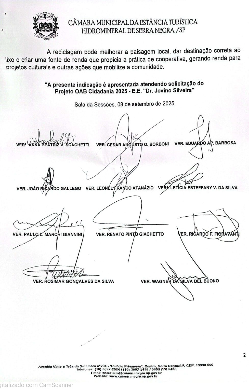 Após explicações sobre os trâmites do trabalho no Poder Legislativo, com o início da 27º Sessão Ordinária, o presidente da Câmara Municipal de Serra Negra, Wagner da Silva Del Bueno (União) solicitou ao secretário da mesa, o vereador Cesar Augusto Oliveira Borboni (Podemos), a leitura das propostas elaboradas pelos alunos e que serão encaminhadas ao chefe do Executivo Municipal em formato de Indicação.