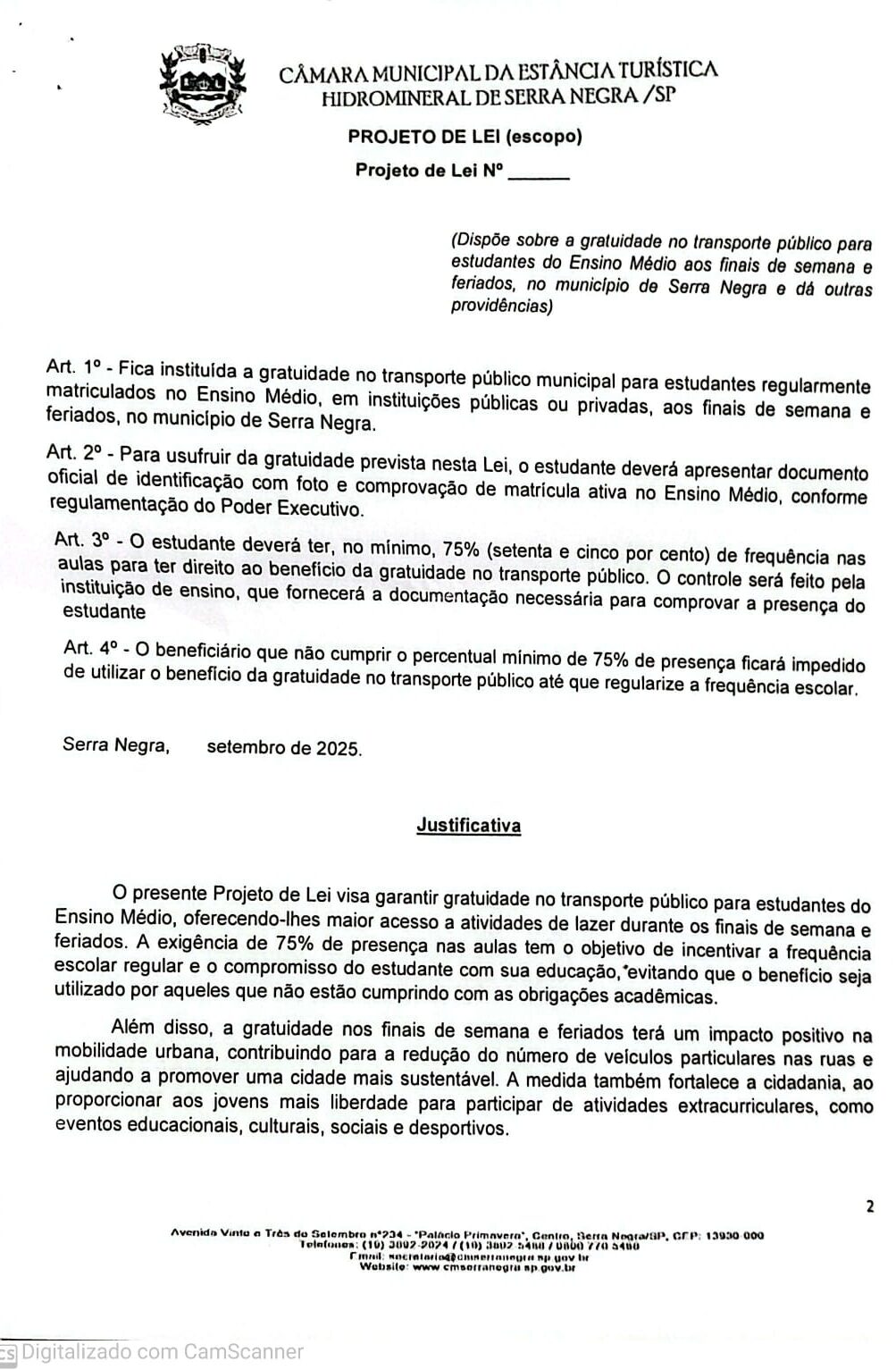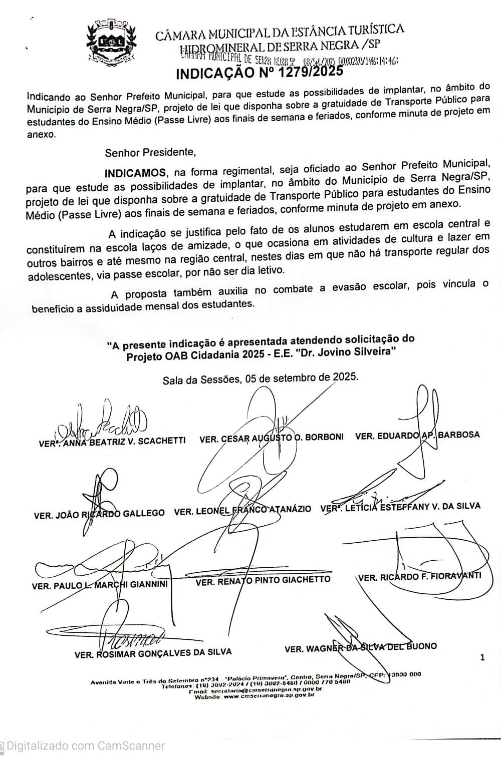 Passe Livre para estudantes do Ensino Médio aos finais de Semana e Feriados – Indicação Nº 1279 / 2025 (2º EM “B”)