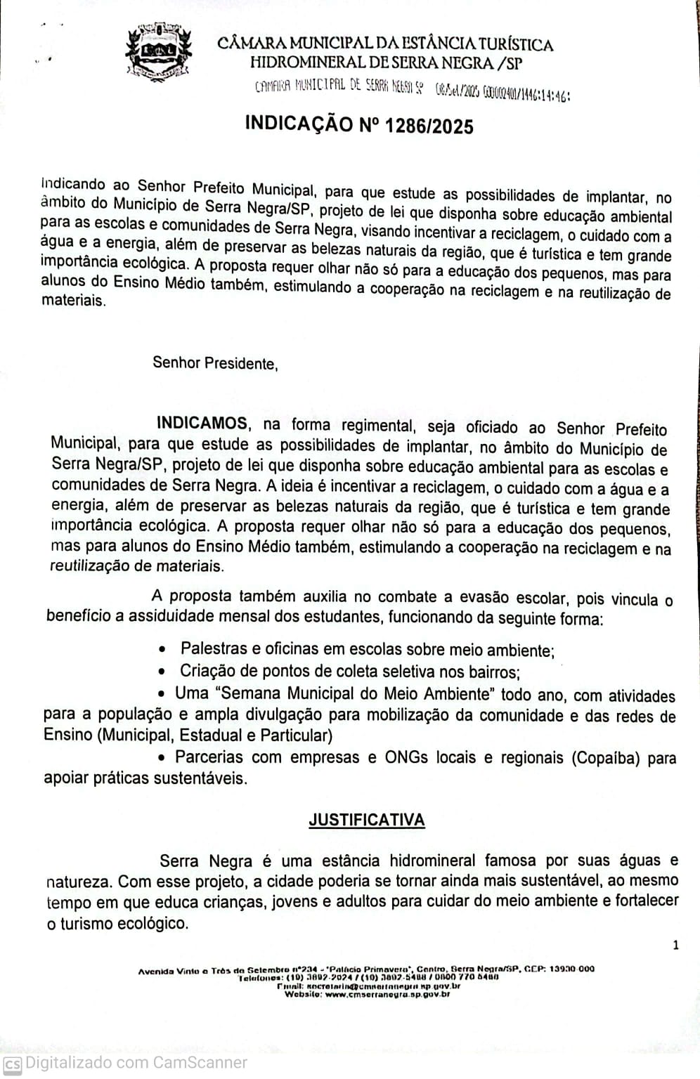 Educação Ambiental e Reciclagem – Indicação Nº 1286 / 2025 (aluno Murilo Zanella Dessimoni do 2º EM “A”).