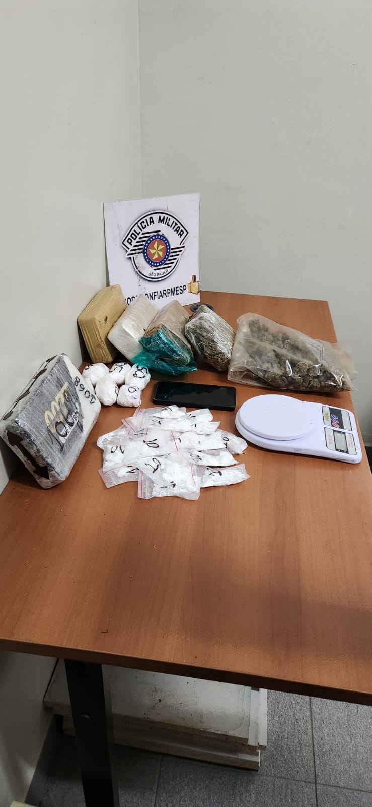 Na ação policial foram aprendidos um tijolo de Crack (981 GRAMAS); 02 tijolos de maconha (1,467 KG); maconha fracionada (240 GRAMAS); tijolo de cocaína (1,075 KG);26 porções de cocaína (515 GRAMAS) e 01 BALANÇA.